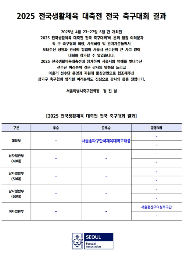 2025 대축전 서울시선수단 결과 페이지 정보 작성자 최고관리자 조회941회 작성일 25-04-28 14:22 본문 이전글제43회 서울특별시장기 축구대회 대진표(최종) 25.05.11 다음글2024 생활체육 서울시민리그 축구리그 결과 안내 24.12.01 목록