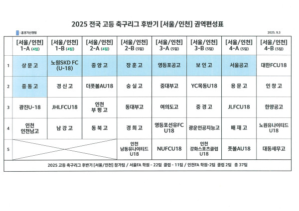 2025 후반기 전국 고등 축구리그[서울/인천] 권역편성표