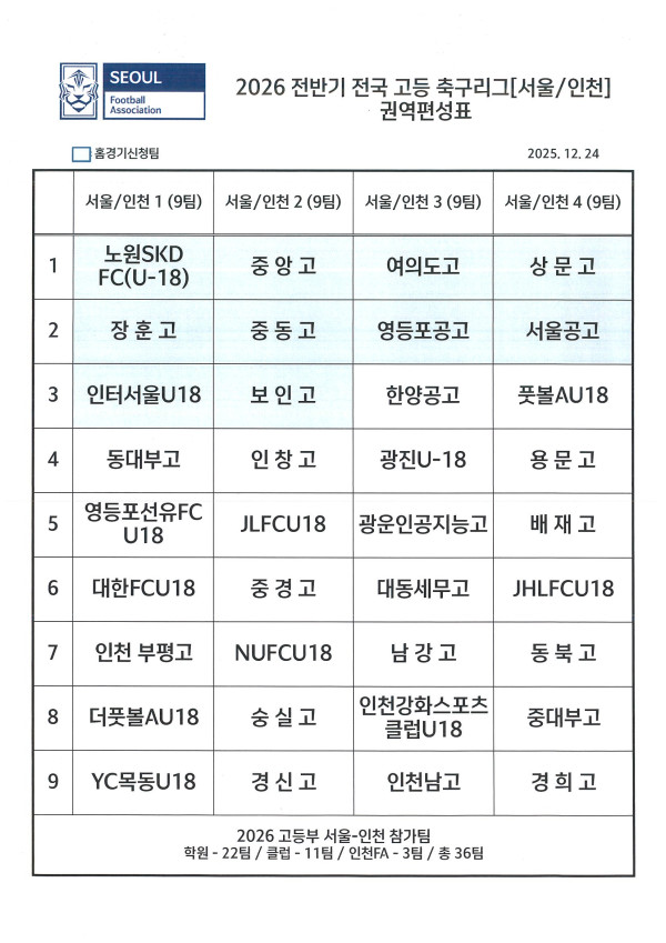 2026 전반기 전국 고등 축구리그[서울/인천]권역편성표