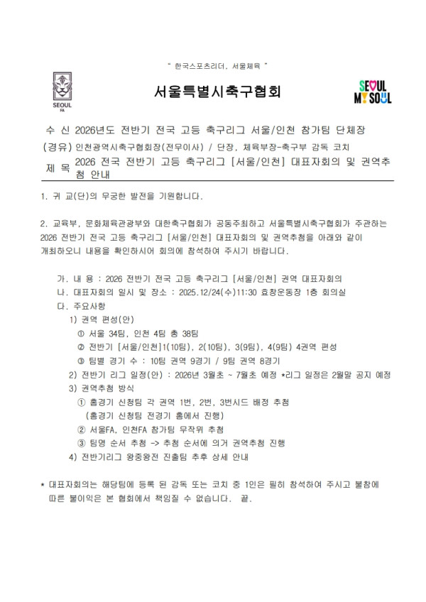 - 2026 전국 전반기 고등 축구리그 [서울_인천] 대표자회의 및 권역추첨 안내.pdf (66.8K) 3회 다운로드 | DATE : 2025-12-16 10:23:33