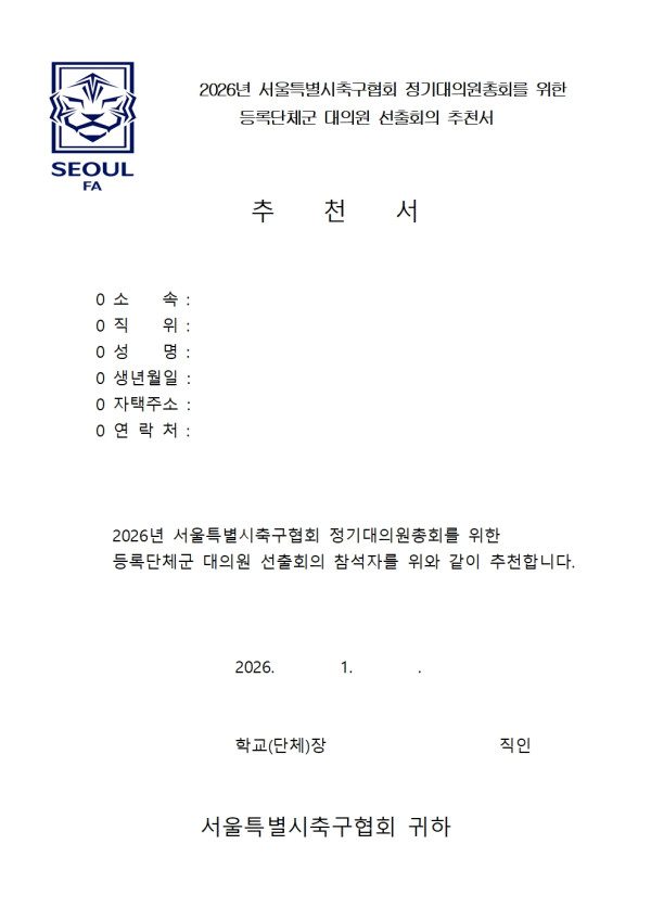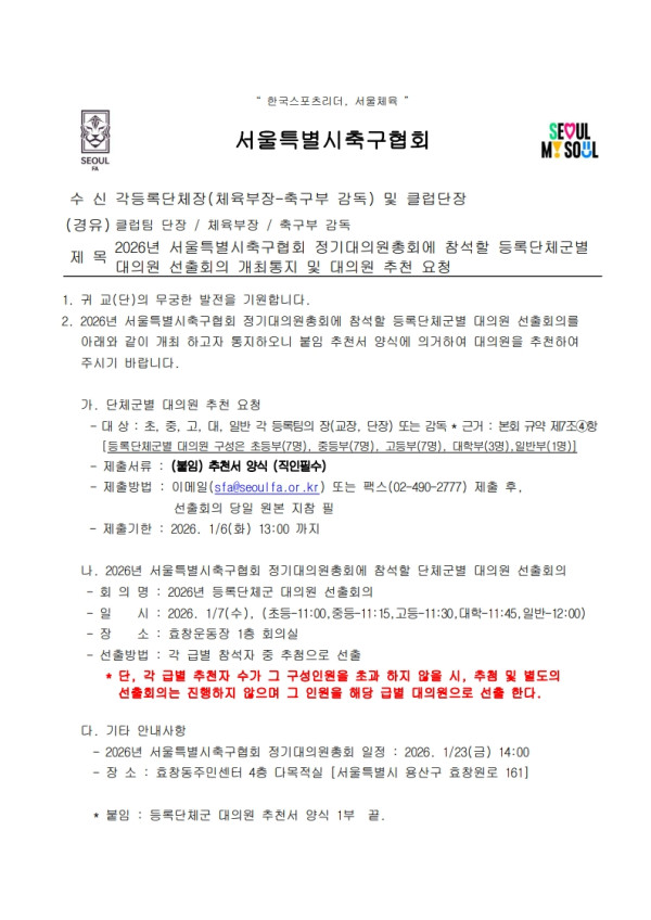 2026년 서울특별시축구협회 정기대의원총회에 참석할 등록단체군별 대의원 선출회의 개최통지 및 대의원 추천 요청