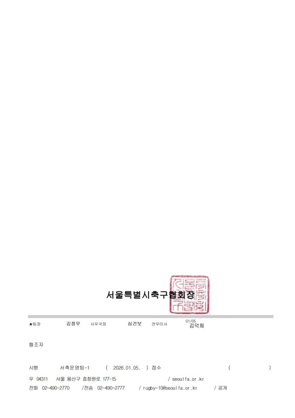 - 2026년 서울특별시축구협회 정기대의원총회에 참석할 등록단체군별 대의원 선출회의 개최통지 및 대의원 추천 요청.pdf (61.2K) 6회 다운로드 | DATE : 2026-01-05 10:52:23