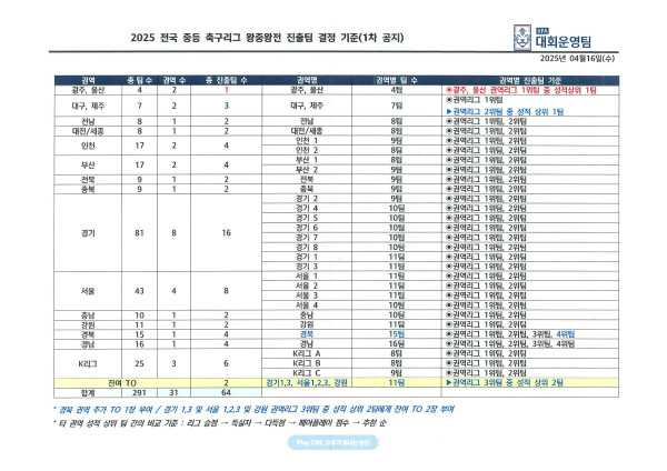 - 2025 전국 중등 축구리그 왕중왕전 운영 계획 및 진출팀 결정 기준 1차 공지.pdf (766.1K) 33회 다운로드 | DATE : 2025-04-16 15:42:35