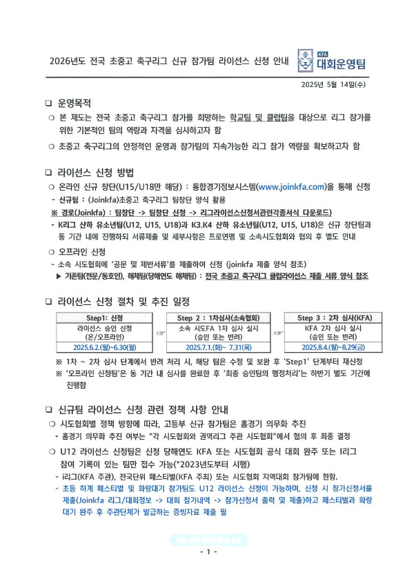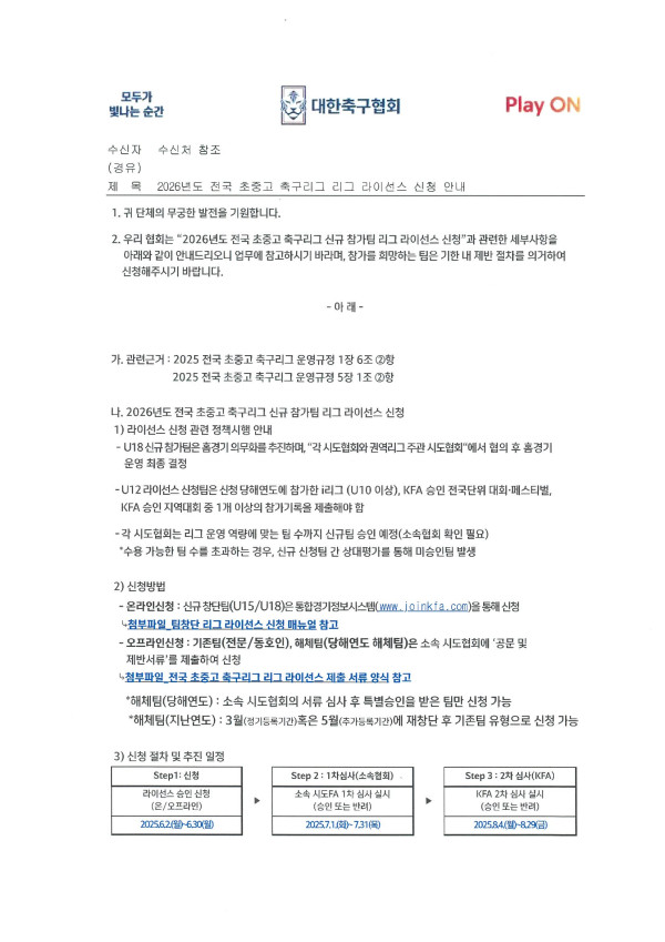 2026년 전국 초중고 축구리그 신규 참가팀 라이선스 관련 문의는