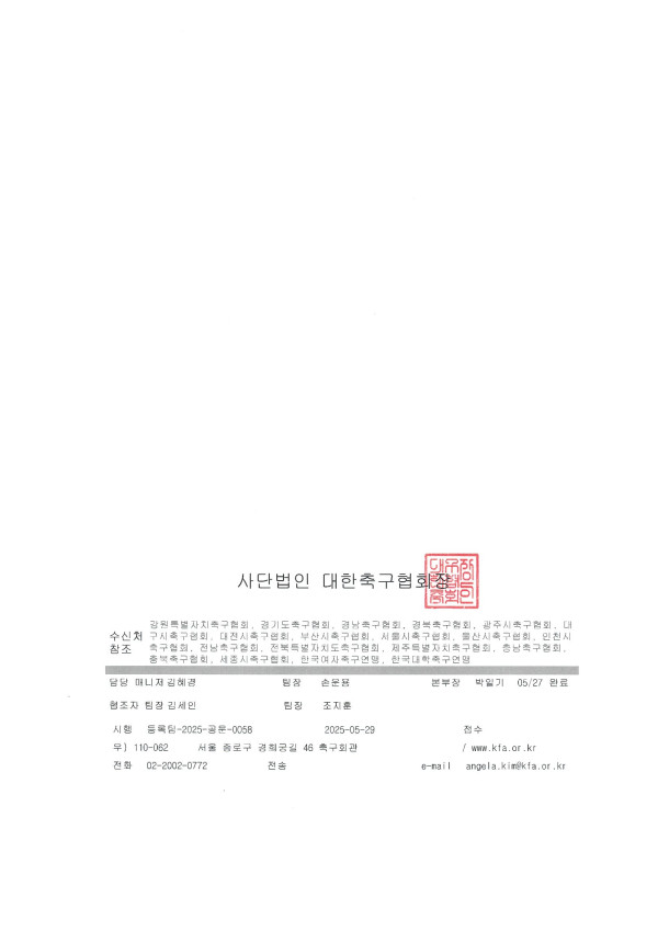 - 팀 등록 담당자와 지도자는 추가 등록, 이적, 탈퇴 등의 업무 진행 시 최신 등록 규정(joinkfa.com, kfa.or.kr)을 필히 참고하시어 불이익이 발생하지 않도록 유의해주시기 바랍니다.