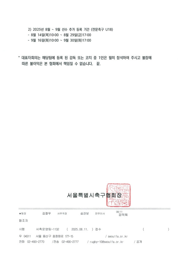 - 2025 후반기 전국 고등 축구리그 [서울인천] 대표자회의 및 권역추첨 안내.pdf (439.9K) 79회 다운로드 | DATE : 2025-08-11 13:21:55