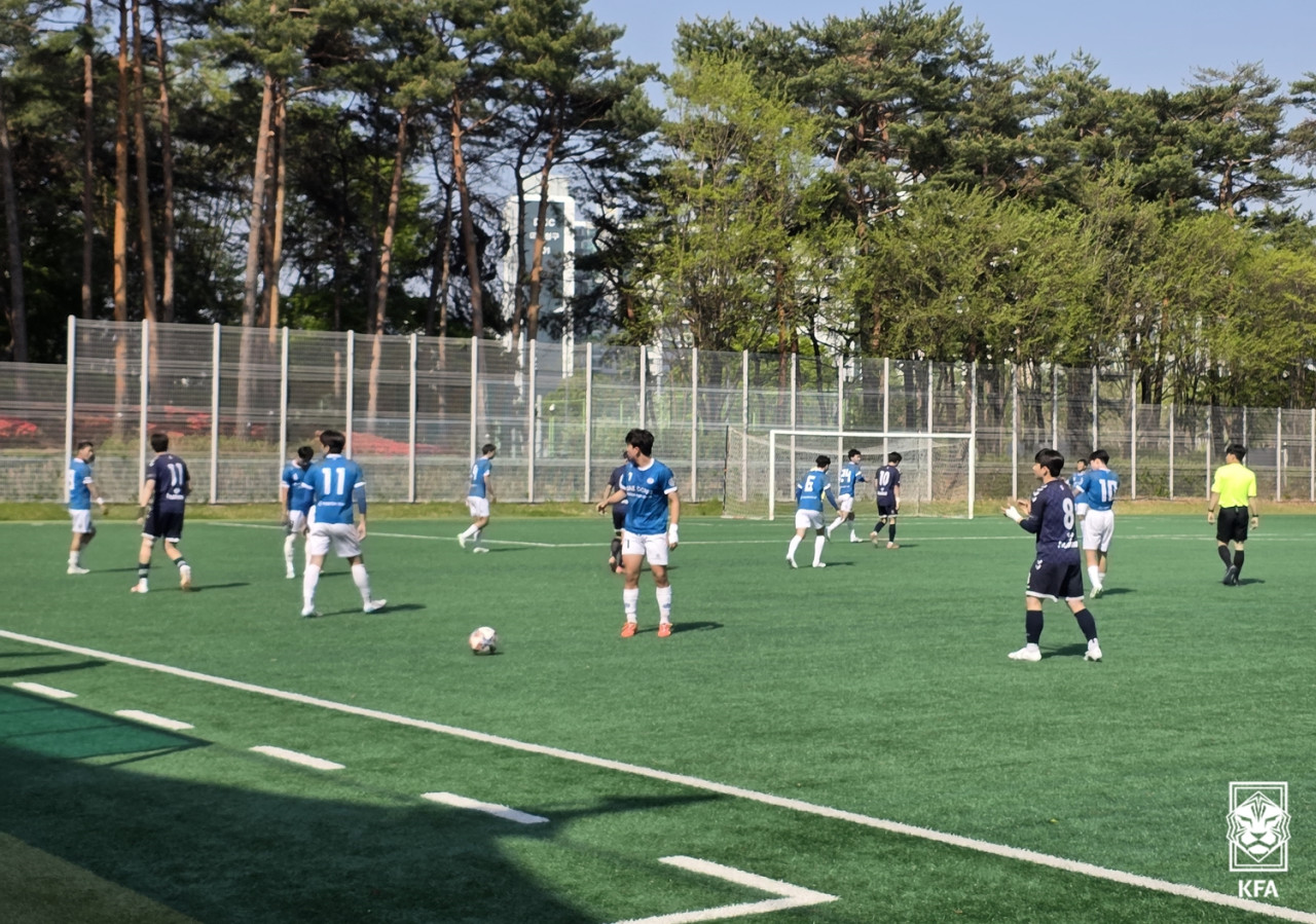 25일 진행된 대동세무고(파란색 유니폼)와 인창고의 2025 전국고등축구리그 서울/인천4권역 경기 장면.