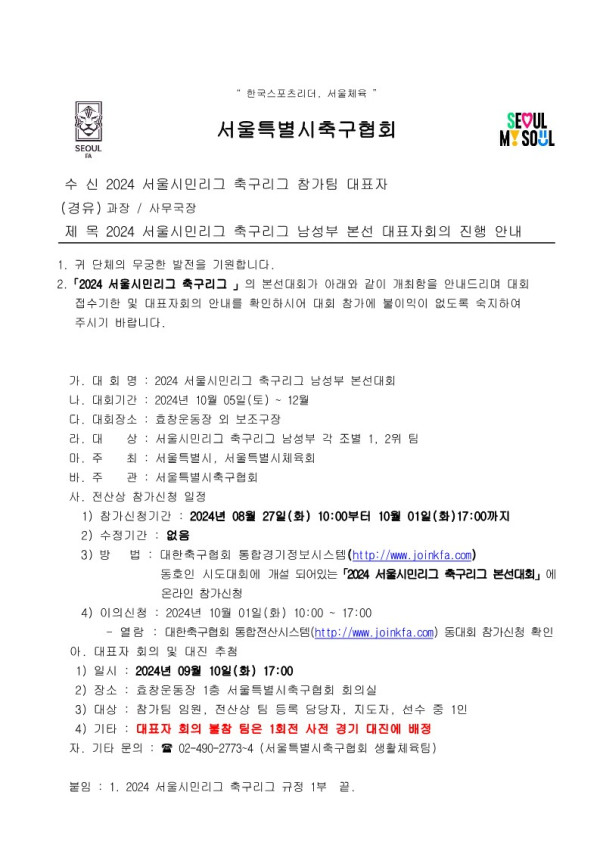 2024 서울시민리그 축구리그 남성부 본선 대표자회의 진행 안내