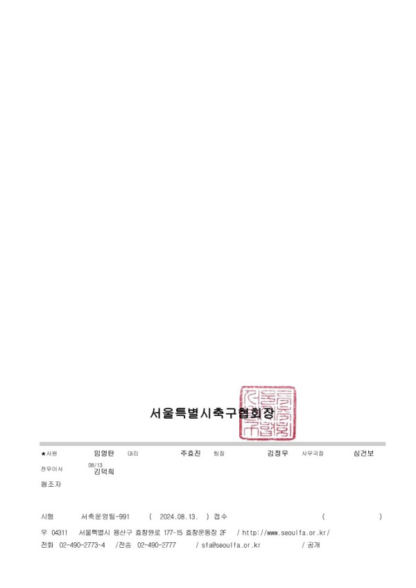 - 이전글2024 서울시민리그 축구리그 여성부 본선 대표자회의 안내 24.08.13