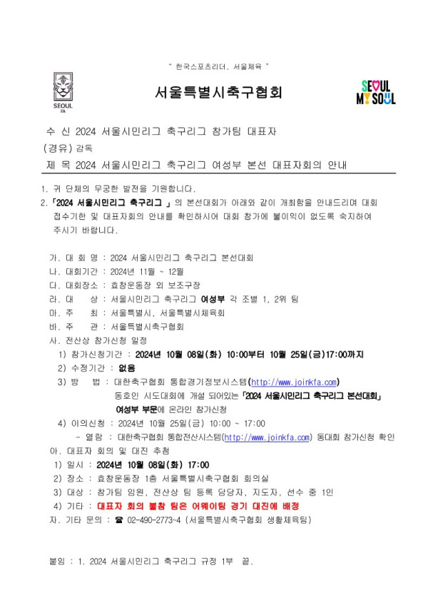 2024 서울시민리그 축구리그 여성부 본선 대표자회의 안내