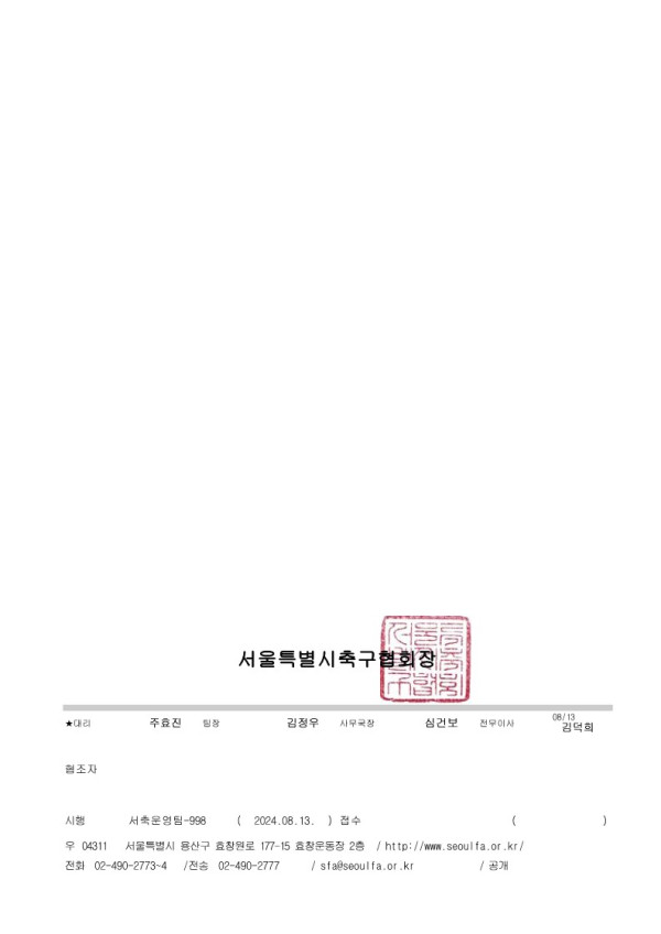 - 다음글2024 서울시민리그 축구리그 남성부 본선 대표자회의 진행 안내 24.08.13