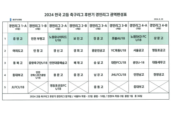[서울/인천] 2024 전국 고등 축구리그(후반기) 권역편성표
