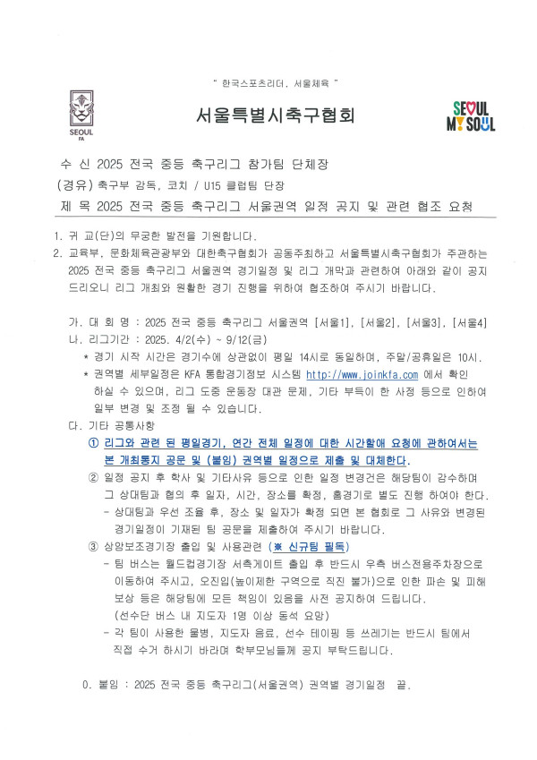 2025 전국 중등 축구리그 서울권역 일정 공지 및 관련 협조 요청
