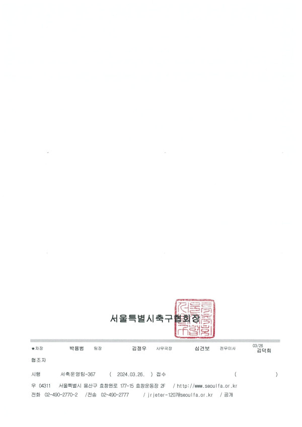 - 2024 전국 중등 축구리그 서울권역 일정 공지 및 관련 협조 요청.pdf (469.4K) 131회 다운로드 | DATE : 2024-03-26 16:49:26
