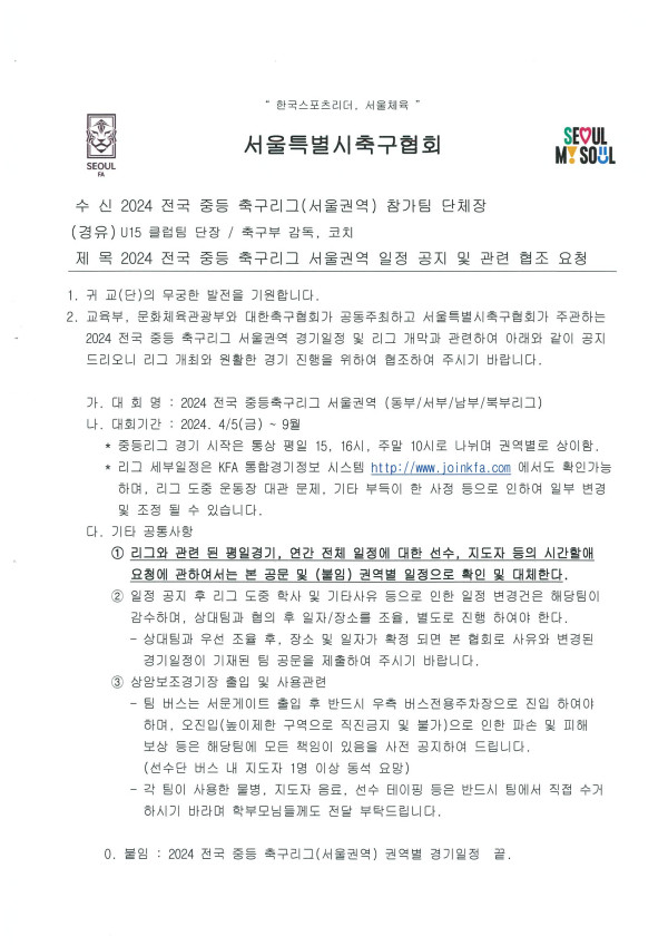 2024 전국 중등 축구리그 서울권역 일정 공지 및 관련 협조 요청 (붙임. 권역별 경기일정표)