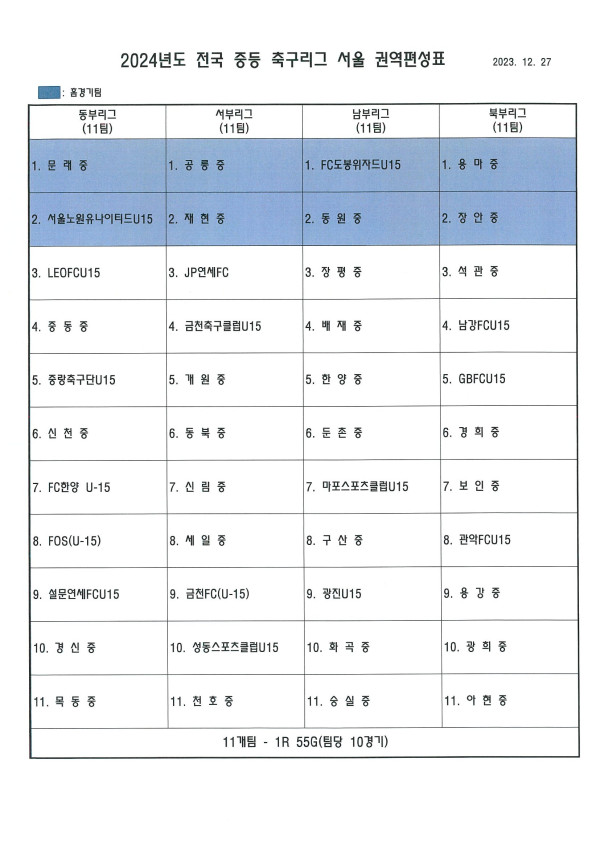 - 2024 전국 중등 축구리그 서울 권역편성표.pdf (281.3K) 179회 다운로드 | DATE : 2023-12-27 13:48:12
