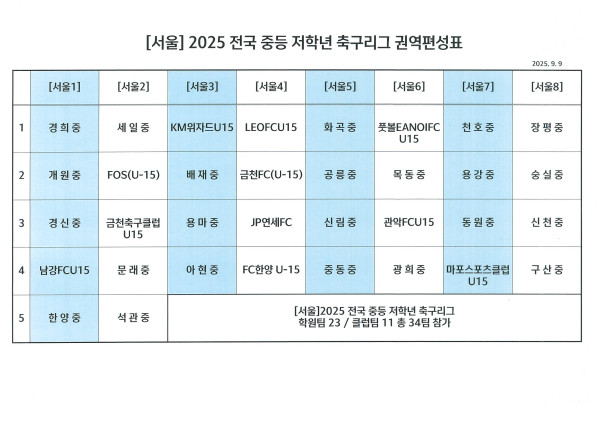 - 2025 전국 중등 저학년 축구리그 권역편성표34팀 kim 완료 9.9.pdf (315.7K) 89회 다운로드 | DATE : 2025-09-09 11:31:24