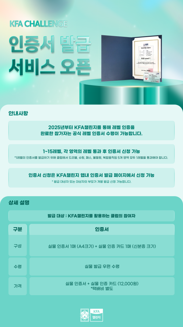 대한축구협회(KFA)가 유소년 축구 기술 인증 프로그램인 KFA챌린지의 공식 인증서 발급 서비스를 시작하였습니다.