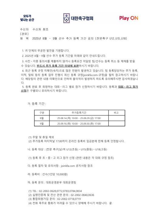 - 2025년 8월 ㆍ 9월 선수 추가 등록 기간 공지 전문축구 U12,U15,U18.pdf (145.1K) 16회 다운로드 | DATE : 2025-07-31 11:31:38