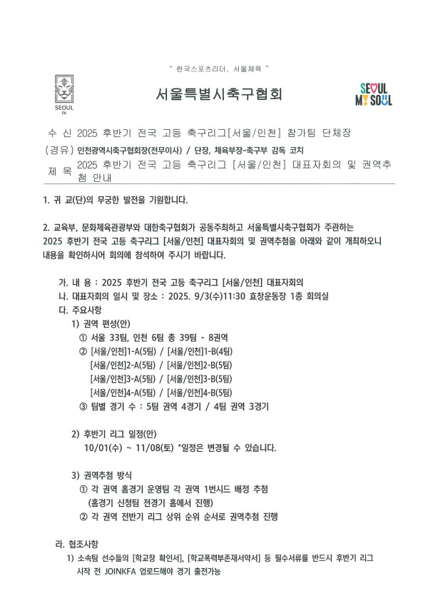 2025 후반기 전국 고등 축구리그[서울/인천] 대표자회의 및 권역추첨 안내