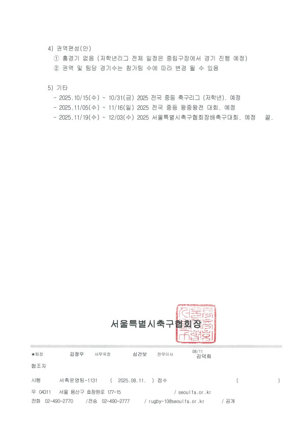 - 2025.10/15(수) ~ 10/31(금) 2025 전국 중등 축구리그 (저학년). 예정