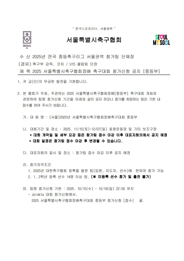 2025 서울특별시축구협회장배 축구대회 참가신청 공지 [중등부]