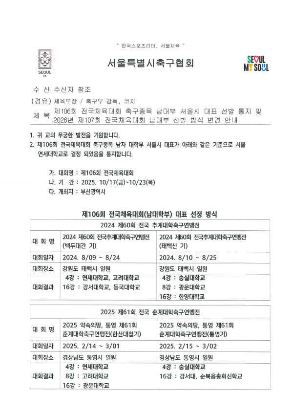 제106회 전국체육대회 축구종목 남대부 서울시 대표 선발 통지 및 2026년 제107회 전국체육대회 남대부 선발 방식 변경 안…