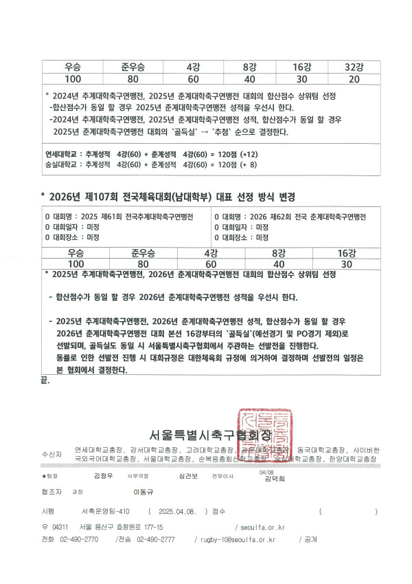 - 제106회 전국체육대회 축구종목 남대부 서울시 대표 선발 통지 및 2026년 제107회 전국체육대회 남대부 선발 방식 변경 안내.pdf (712.1K) 3회 다운로드 | DATE : 2025-04-08 14:50:16