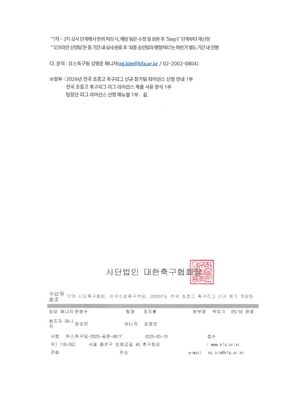 2026년 전국 초중고 축구리그 신규 참가팀 라이선스 관련 문의는