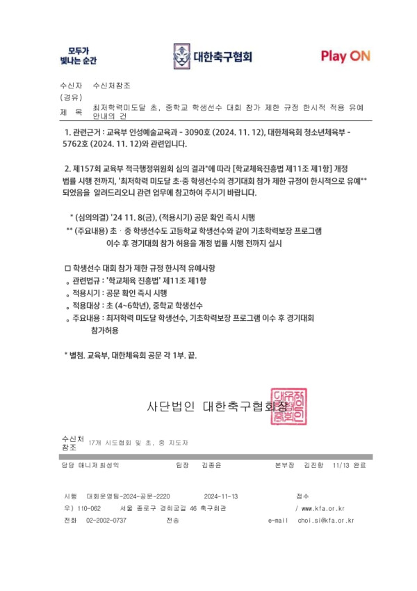 - KFA 최저학력 미도달 초. 중학교 학생선수 대회 참가제한 규정 한시적 적용 유예 안내의 건.pdf (174.2K) 7회 다운로드 | DATE : 2024-11-13 15:16:50