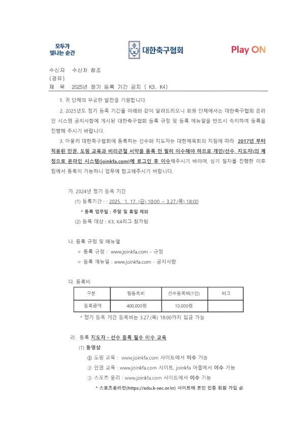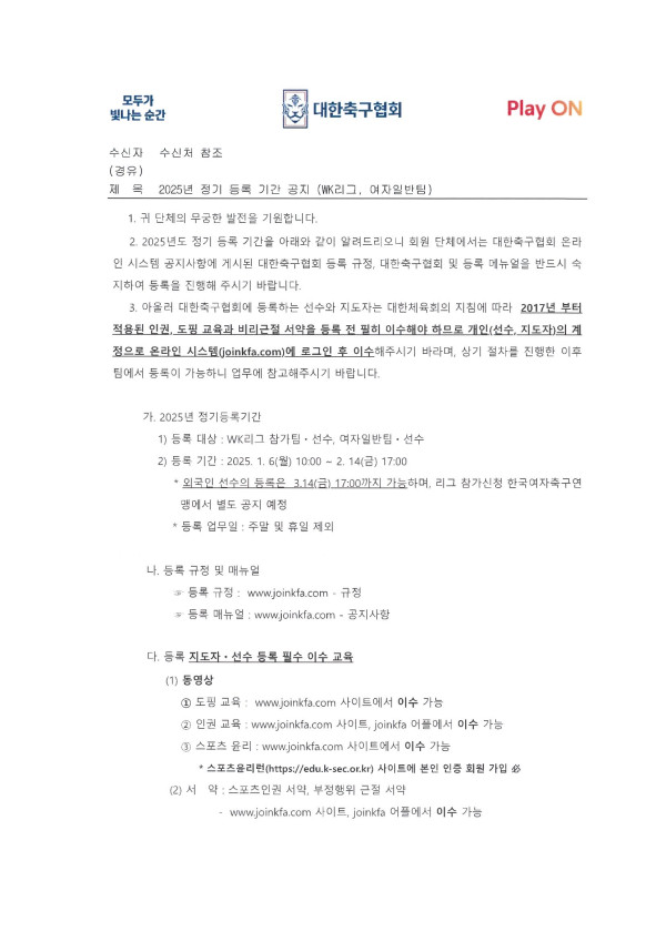 2025 정기 등록 기간 공지(전문체육 초중고, WK리그, 대학, K3,K4