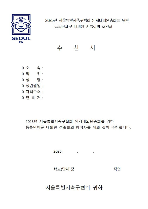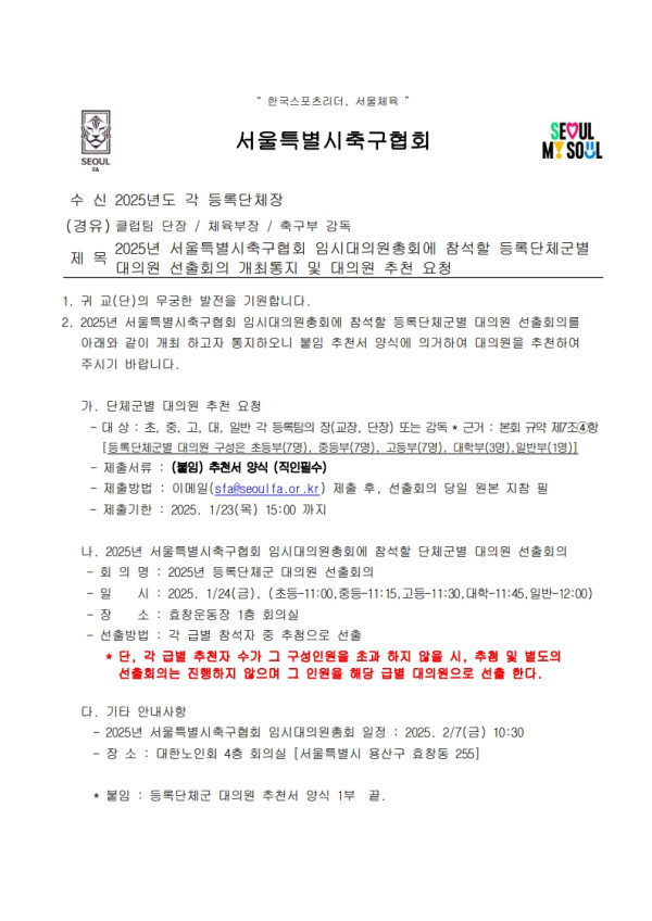 2025 서울특별시축구협회 임시대의원총회 등록단체군별 대의원 선출회의 개최통지 및 대의원 추천 요청
