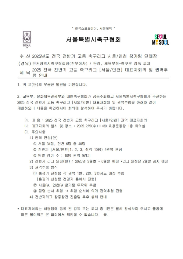 2025 전국 전반기 고등 축구리그 [서울/인천] 대표자회의 및 권역추첨 안내