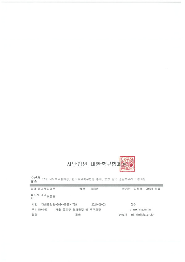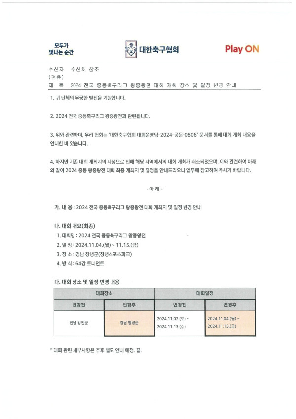- 2024 전국 중등 축구리그 왕중왕전 대회 개최 장소 및 일정 변경 안내.pdf (340.2K) 25회 다운로드 | DATE : 2024-09-03 10:24:39