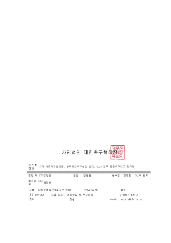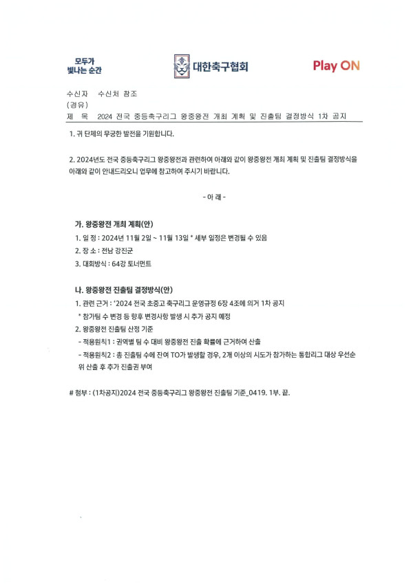 - [KFA 공문]2024 전국 중등축구리그 왕중왕전 개최 계획 및 진출팀 결정방식 1차 공지.pdf (99.5K) 82회 다운로드 | DATE : 2024-04-22 13:25:29
