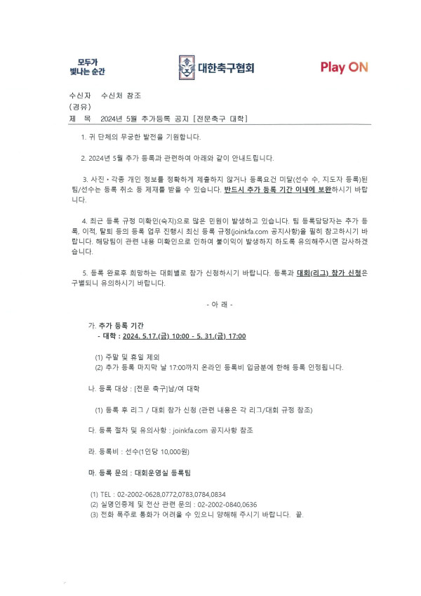 - 2024년 5월 추가등록 공지 [전문축구 대학].pdf (142.3K) 10회 다운로드 | DATE : 2024-04-11 13:10:33