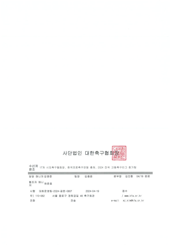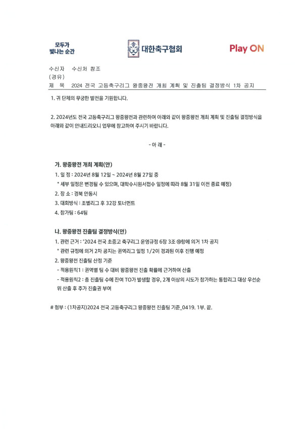 - [KFA 공문]2024 전국 고등축구리그 왕중왕전 개최 계획 및 진출팀 결정방식 1차 공지.pdf (101.0K) 20회 다운로드 | DATE : 2024-04-22 13:24:33