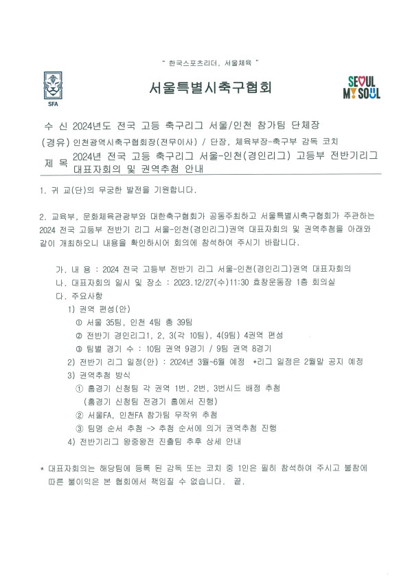 - 2024 전국 고등축구리그 서울-인천경인리그 전반기리그 대표자회의 및 권역추첨 안내 공문.pdf (373.7K) 43회 다운로드 | DATE : 2023-12-19 14:40:13