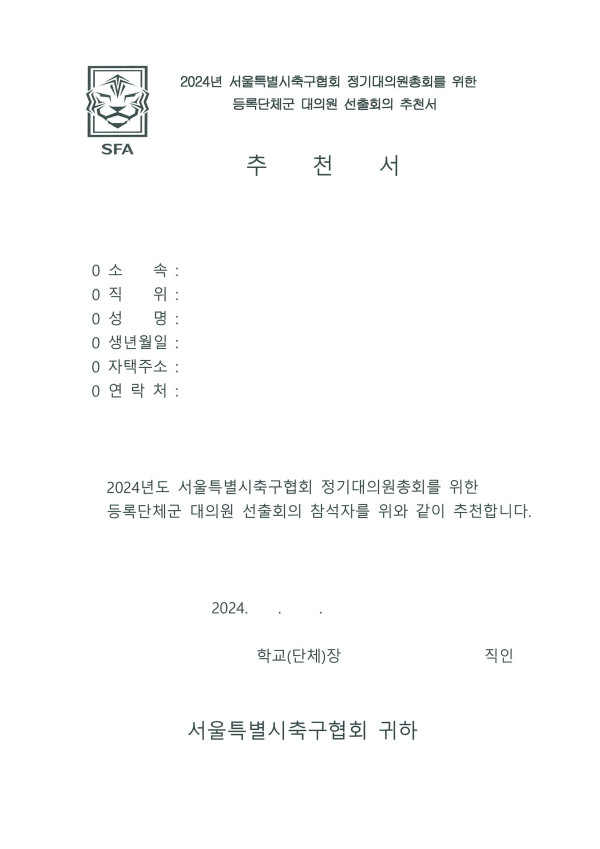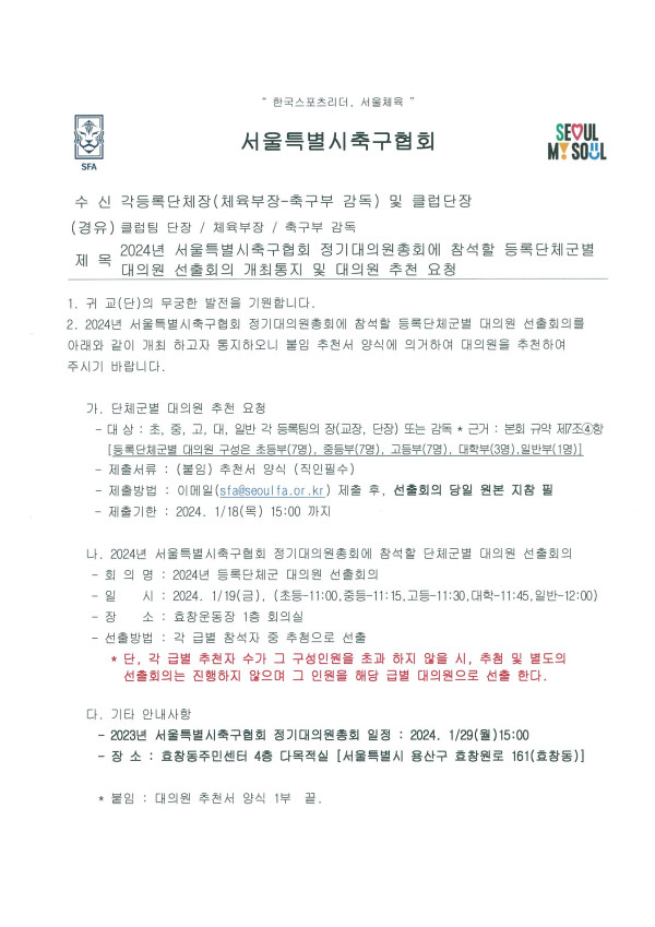 2024 서울특별시축구협회 정기대의원총회 등록단체군별 대의원 선출회의 개최통지 및 대의원 추천 요청