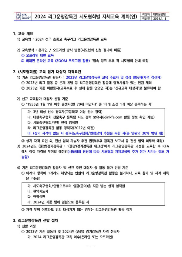 - 공문2024년 리그운영감독관 교육 계획 안내.pdf (3.0M) 19회 다운로드 | DATE : 2024-01-09 14:03:19