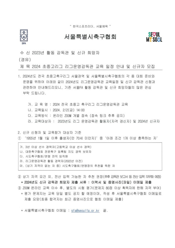 가. 교 육 명 : 2024 전국 초중고 축구리그 리그운영감독관 교육(서울권역)