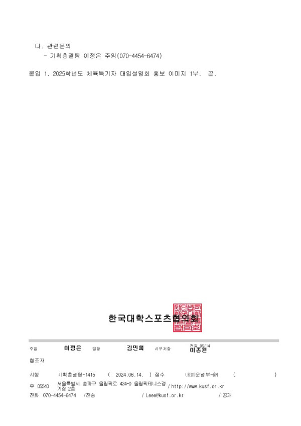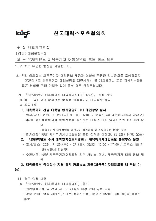 2025학년도 체육특기자 대입설명회 (홍보) 페이지 정보 작성자 최고관리자 조회2,989회 작성일 24-06-19 10:49 본문 이전글2024년 효창운동장 전기교체공사에 따른 서울시축구협회 사무국 휴무 알림 24.07.18 다음글2024년 7월 선수 추가 등록 기간 안내 [WK리그, 여자일반] 24.06.17 목록