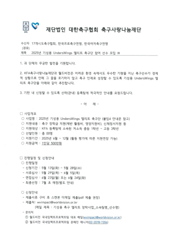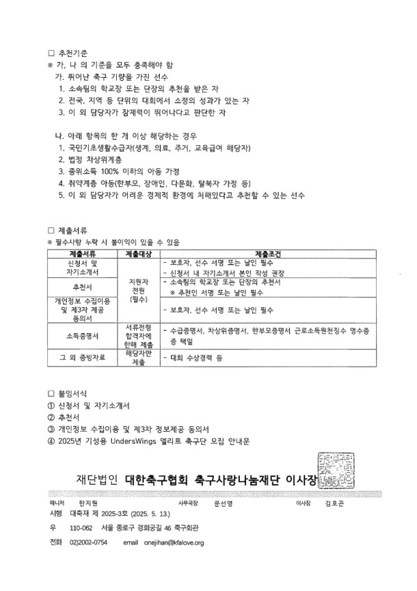 - [공문] 2025년 기성용 UndersWings 엘리트 축구단 참여 선수 모집 2.pdf (415.5K) 6회 다운로드 | DATE : 2025-05-23 12:51:53
