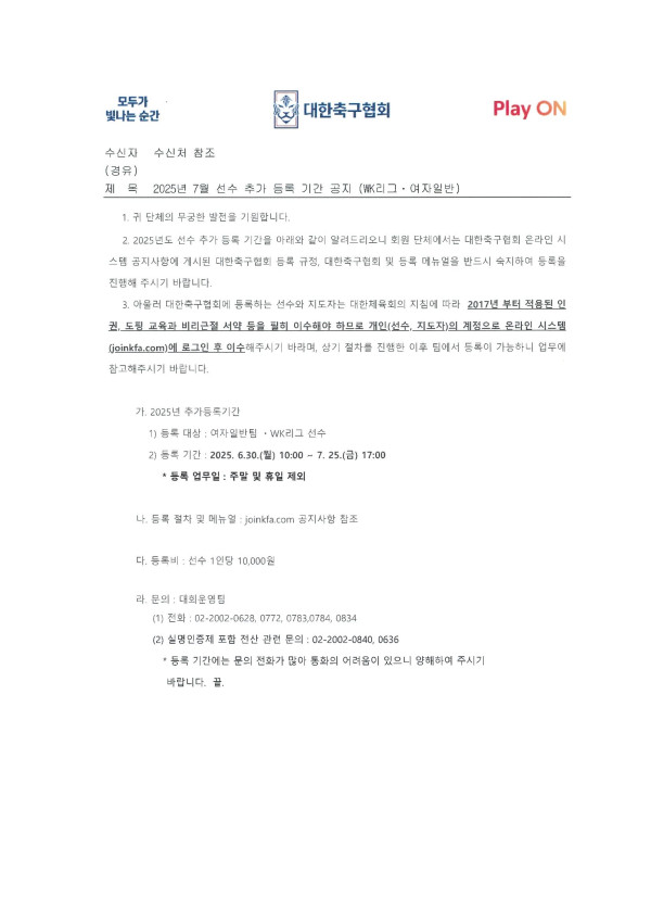 - 2025년 7월 선수 추가 등록 기간 공지 WK리그ㆍ여자일반.pdf (159.2K) 5회 다운로드 | DATE : 2025-06-02 15:38:22