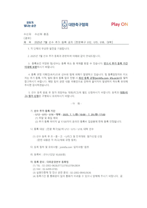 2025년 7월 선수 추가 등록 공지 [전문축구 U12, U15, U18, 대학]