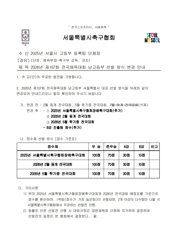 2026년 제107회 전국체육대회 남고등부 서울특별시 대표 선발 방식을 아래와 같이 변경되어 안내드리오니 필히 확인하여 주시기 바랍니다.