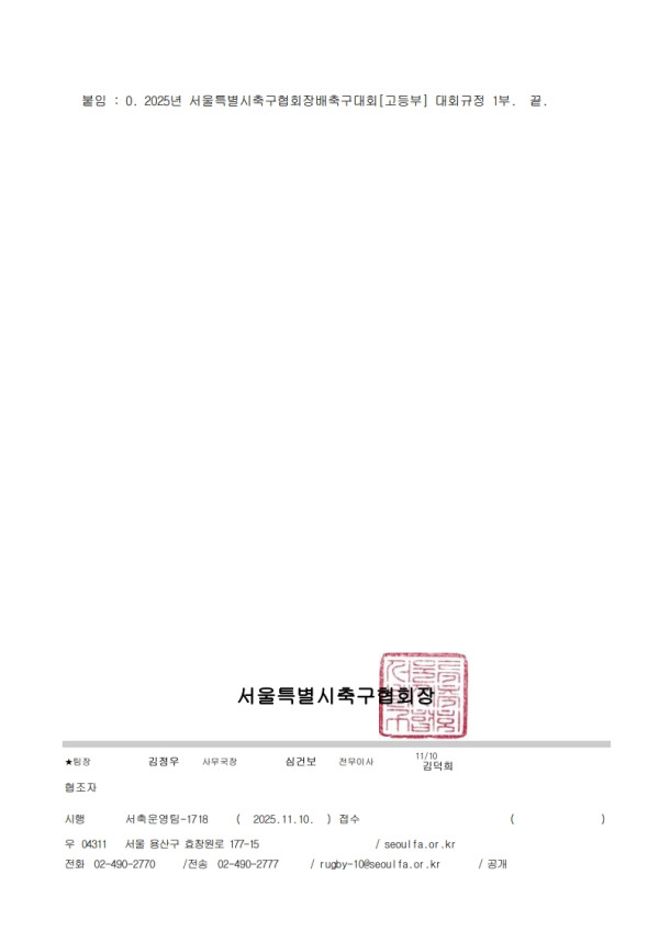붙임 : 0. 2025년 서울특별시축구협회장배축구대회[고등부] 대회규정 1부. 끝.