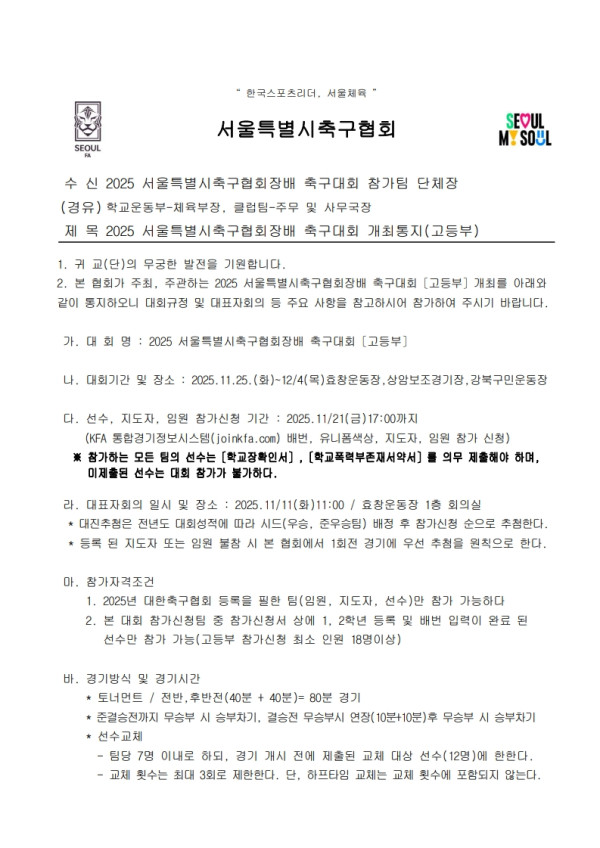 2025 서울특별시축구협회장배 축구대회 개최통지(고등부)