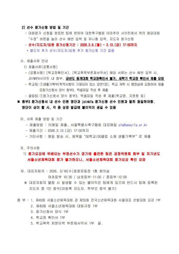 - 제출방법 : 이메일 제출, 서울특별시축구협회 대표메일 sfa@seoulfa.or.kr