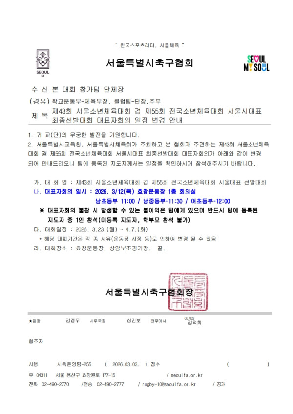 - 제43회 서울소년체육대회 겸 제55회 전국소년체육대회 서울시대표 최종선발대회 대표자회의 일정 변경 안내.pdf (57.4K) 26회 다운로드 | DATE : 2026-03-03 16:50:34